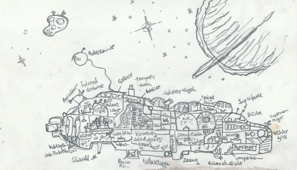 Das Schiff selbst ist von eher zufälliger Form und beherbergt eine Vielzahl von besonderen Einrichtungen wie einen Wald mit unendlichen Walnussvorrat, einen Wasserfall, Ateliers und Ausstellungsräume für die kreativen Momente, eine Bar und einen Klubraum für Festivitäten, eine Sex-Kammer mit einer Auswahl an an die Schwerelosigkeit angepassten Gerätschaften und sogar einen Panzer, der von den männlichen Crew-Mitgliedern als unbedingt nötig empfunden wurde um auf fremden Planeten „ein wenig für mehr Rums zu sorgen“. Eine große Bibliothek mit Sofaecken und einem Globus als geheimes Drink-Reservoir runden das Spektrum für die eher intellektuellen Bedürfnisse ab.
